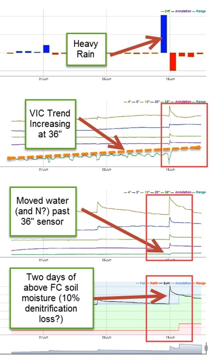 a. You may be able to see the N being leached through the soil with the EC graphs. I’ve noticed several fields with course texture soils with significant increase trends in the lower (20 & 36”) sensors. Certainly, some of these ions are Nitrate, which means we have pushed some of our N below our effective root zone.