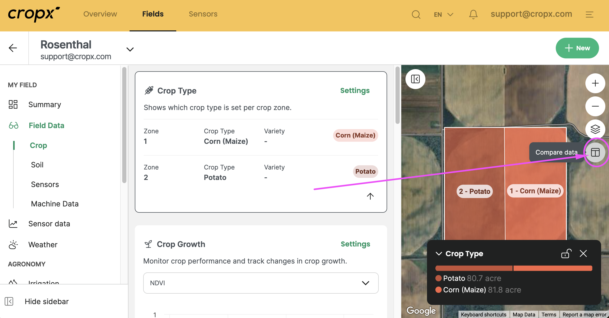 Navigate to the desired field, go to the Field Data to see the field map, and select the “Compare data” button under the map zoom and map layers on the right.