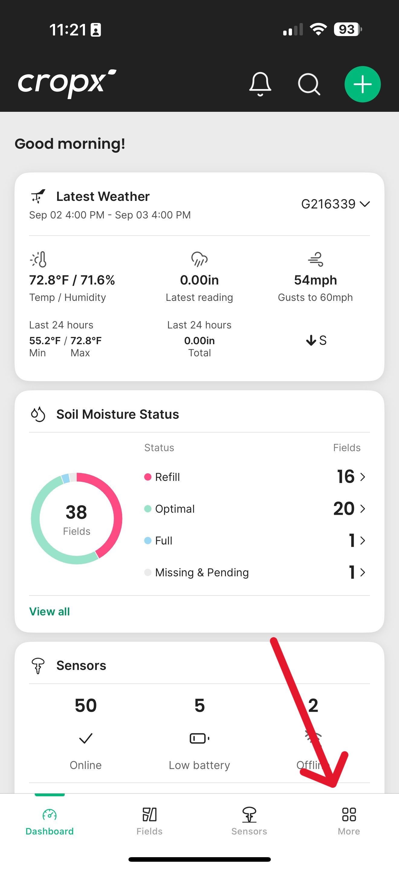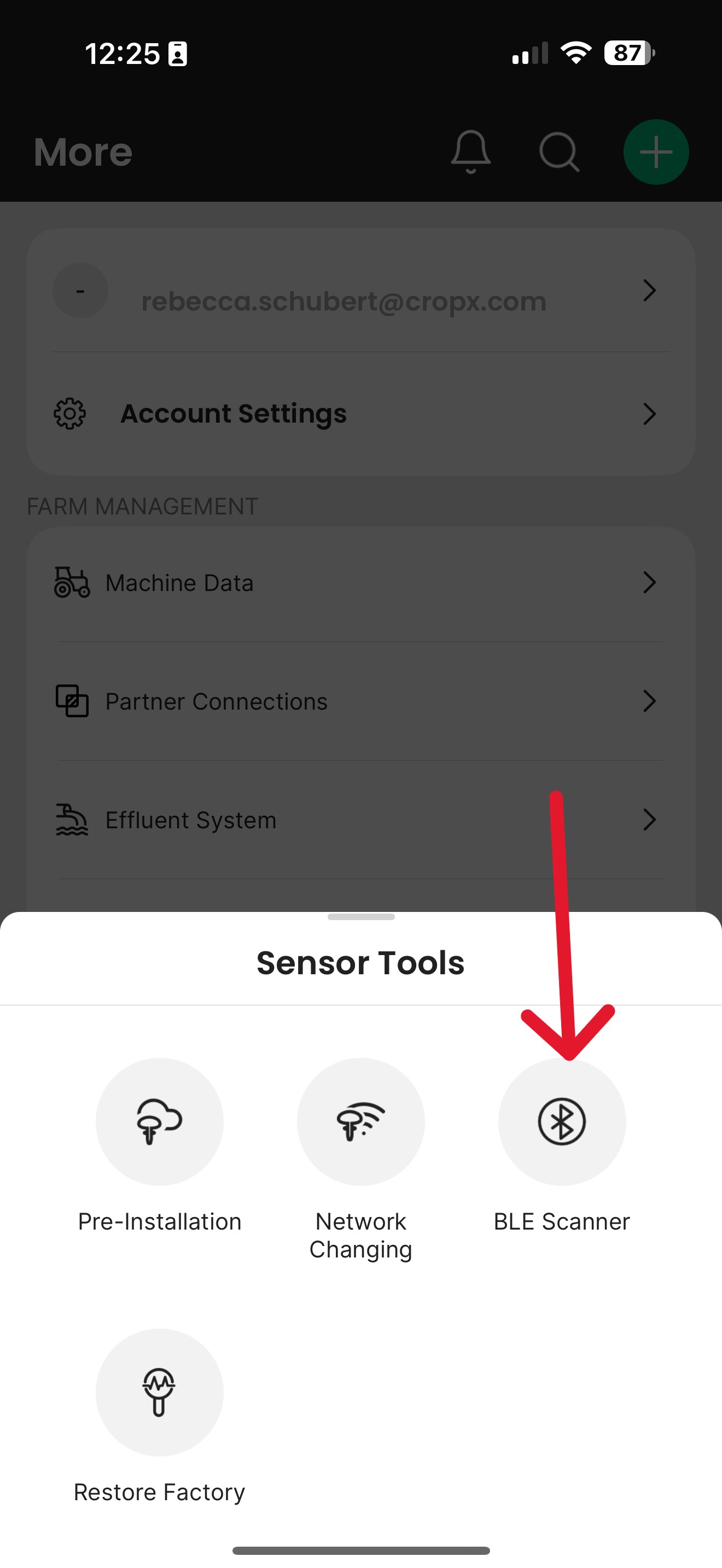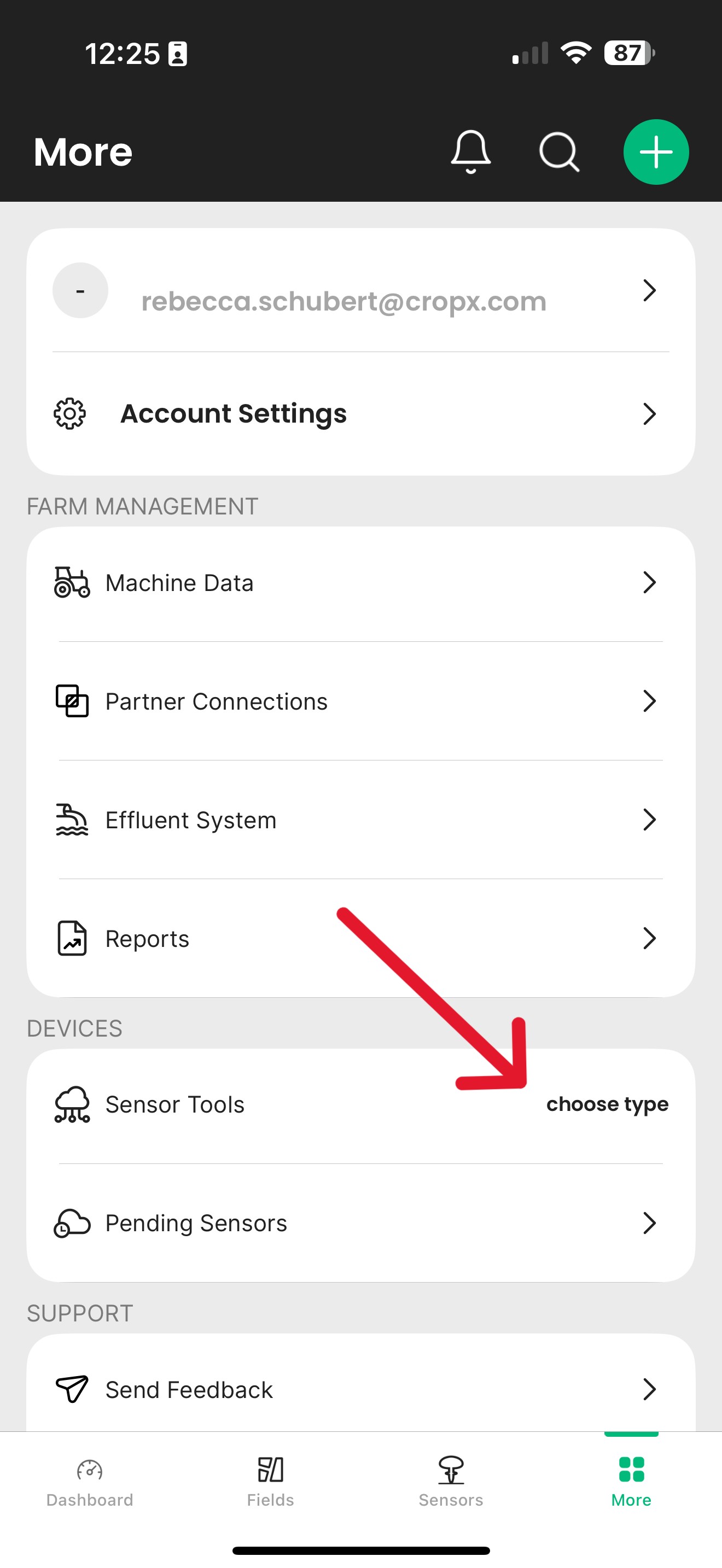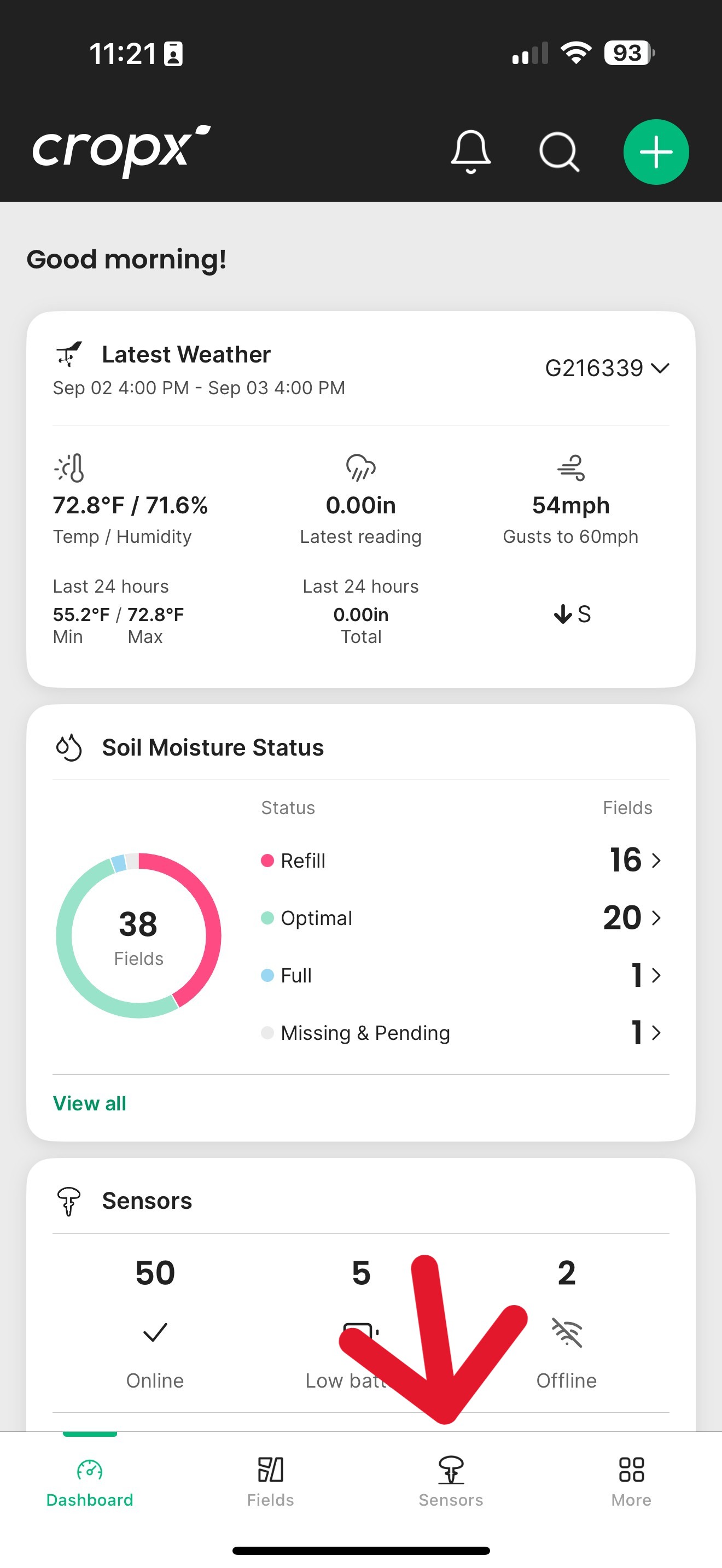 Open the CropX mobile app and select Sensors from the bottom menu.