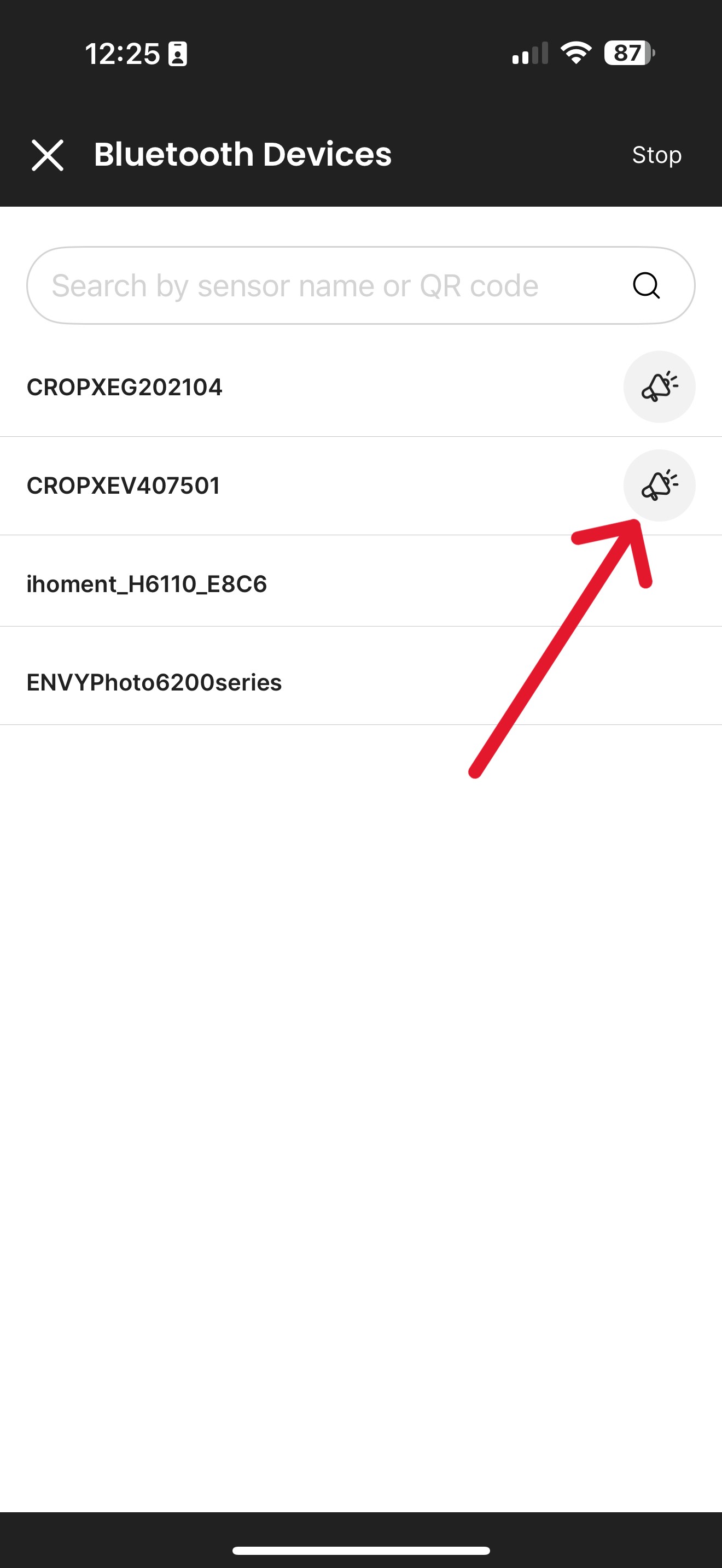 In the app, open More > Sensor Tools > BLE Scanner > Hit the Megaphone Graphic Next to the Sensor You Wish to Locate.