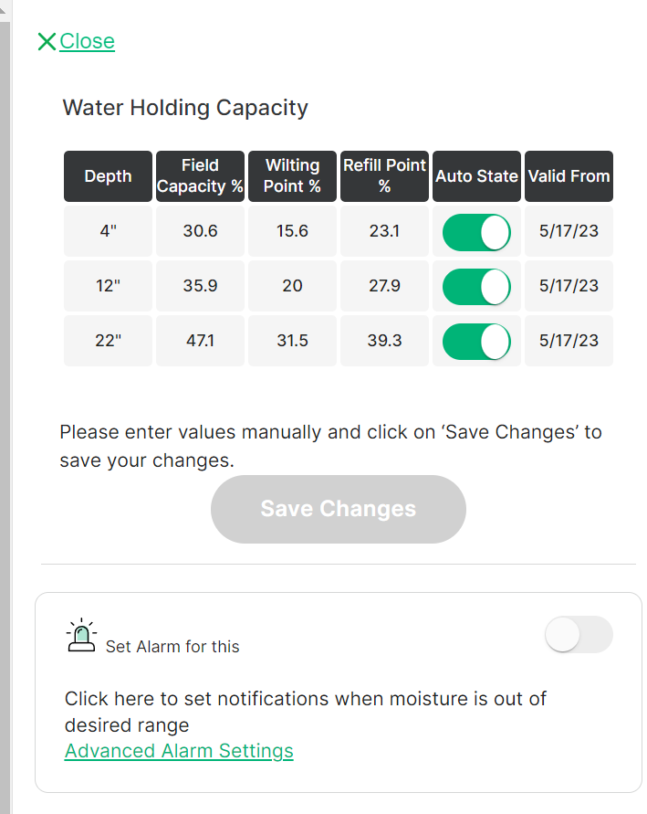 Here, you’ll see that you can adjust the Field Capacity (FC), Wilting Point (WP), and Refill Point (RP) for a sensor’s depths